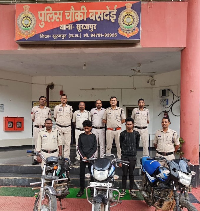चौकी बसदेई पुलिस ने दो मोटरसाइकिल चोरों को गिरफ्तार किया हैं, जो चोरी की बाइक बेचने की फिराक में घूम रहे थे। एचडी रेलवे फाटक के पास सूचना मिलने पर, पुलिस ने तुरंत कार्रवाई की और दोनों संदिग्धों को पकड़ लिया।पूछताछ में पकड़े गए चोरों ने अपना नाम बताया – विकास देवांगन, उम्र 22 वर्ष, निवासी घुसा, थाना झिलमिली, और रितेश कुमार सारथी, उम्र 22 वर्ष, निवासी भटठा पारा, सूरजपुर, थाना सूरजपुर।